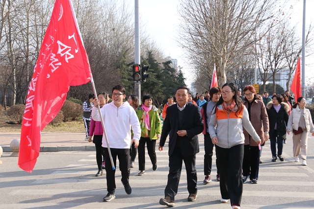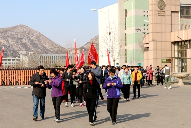三月的泉城春意盎然,乍暖还寒,却丝毫未能抵挡住参加学院健步走活动教职工们的热情。3月7日下午,在学院党委的高度重视下,由工会与体育教学部组织的我院教职工健步走活动在我校南门顺利举行。该活动从学校南门出发,沿大学路辅道行进,到紫薇路途经西门站点和北门站点,至居里路前行到大学路进入学校南门,返回学校操场东北门,活动全程3公里。行进过程中设置了先进性别文化宣传、猜谜语、脑筋急转弯等游戏答题环节,增加了趣味性。沐浴着春光,树木含翠、樱花怒放,教职员工们精神抖擞,有的一边沉思答题,一边健步快走;有的一边互相交流讨论,一边活动筋骨,大家既丰富了知识,又锻炼了身体,欢声笑语洒满女院。本次参加活动人数达到全校教职工总人数的95%。
