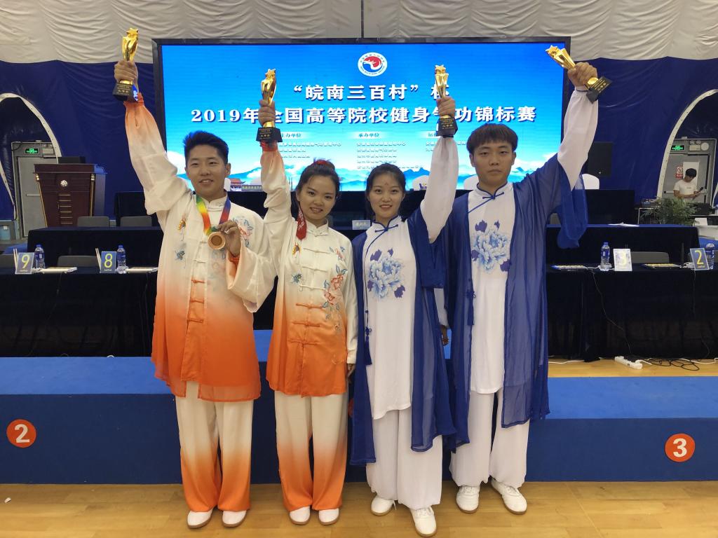 经过激烈的角逐,我校健身气功代表队不负众望,取得两项普通组集体项目二等奖,两项集体项目三等奖,来自旅游学院的梁永和获得大舞男子个人项目第三名,工商管理学院徐晓菲获得八段锦女子个人项目第四名,教育学院傅久修获得五禽戏女子个人项目第五名,体育教学部牛继超博士获得五禽戏男子个人项目第七名的好成绩。此外,工商管理学院的徐晓菲同学被评为优秀运动员,吕梅老师被评为优秀教练员。