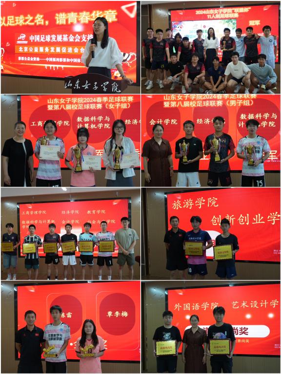 6月27日下午,山东女子学院第八届足球联赛暨颁奖仪式在求真楼路演厅举行。校团委书记苏婧、体育教学部主任刘淑芬、学生工作处副处长赵丽丽、党支部书记曹斌、教师闫云娇、张文出席仪式并为获奖团队和个人颁奖,颁奖仪式由李小健老师主持。